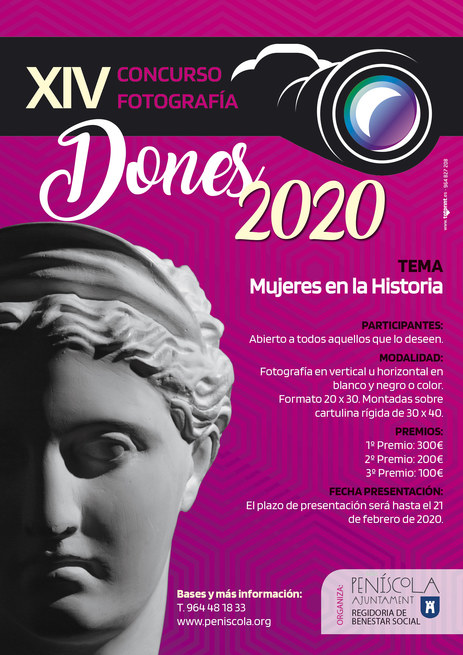 L’Ajuntament de Peníscola, a través de la Regidoria de Benestar Social, ha convocat una nova edició del Concurs de Fotografia DONES 2020 amb l’objectiu de celebrar el Dia Internacional de la Dona Treballadora. Amb aquest consolidat certamen "volem homenatjar i fer visibles tant les dones com les seues circumstàncies en el seu dia internacional", argumenta la regidora de l’àrea, María Jesús Albiol. Les fotografies a concurs hauran de tindre com a tema principal les "Dones en la història", poden participar-hi totes aquelles persones que ho desitgen i cada participant podrà presentar el nombre d’imatges que considere oportú, ja que no hi ha un màxim d’imatges a presentar. El jurat del concurs estarà format per la regidora de Benestar Social, el regidor de Cultura, la treballadora social, la psicòloga del SEAFI, tres fotògrafs/es professionals i dos alumens de l’IES Alfred Ayza.