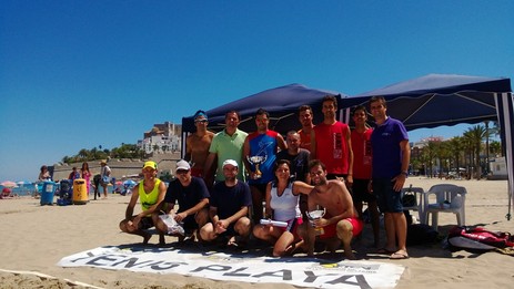 El cap de setmana passat es va celebrar en la platja Nord de Peníscola la sisena prova del segon circuit popular de Tennis Platja de la Comunitat Valenciana. Amb 16 parelles masculines participants i un dia esplèndid, vam gaudir de platja, sol i esport. La prova va començar a les 10 AM amb un quadre eliminatori, i els primers eliminats van passar a un quadre de consolació, que van guanyar Jaime Miguel i Santiago Angulo. Al llarg del matí van anar evolucionant els partits, deixant eliminats en semifinals als fins ara imbatuts, els germans Roberto i David Riera, de forma que la final es va tindre lloc entre la parella se Benicarló, formada per Juanma Rovira i Carlos Ferrer i la parella valenciana formada pels germans Pepe i Nacho Jabaloyes, que van aconseguir la victòria final.