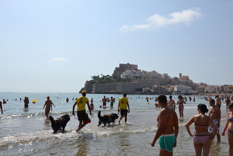 Els dos gossos, pertanyents a l’agrupació nacional de rescat Mare Nostrum, col·laboren amb exercicis i rutines preventius al llar de quatre dies a la setmana en la platja peniscolana, sumant així seguretat al dispositiu de salvament.