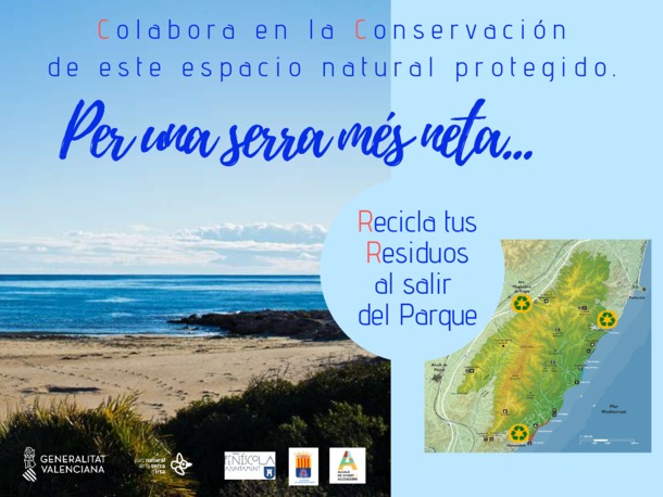 Tots podem col·laborar posant el nostre granet d'arena al depositar els nostres residus als contenidors de reciclatge que trobaràs a les sortides del Parc i així millorar l'estat de salut i conservació d'aquest espai natural protegit, la Serra d'Irta.