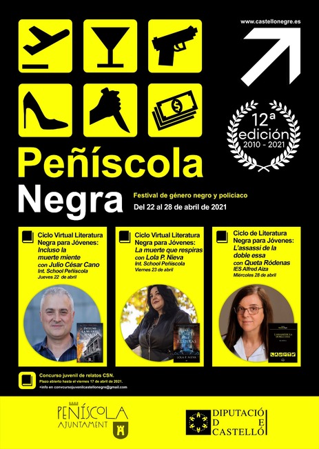 La Regidoria de Cultura aposta un any més pel cicle de literatura negra per a joves com a base de la programació d'aquest festival de gènere negre, que arranca el pròxim 22 d'abril i l'objectiu principal del qual en la seu de Peníscola és acostar la literatura i fomentar la lectura entre els alumnes de primària i secundària, de la mà d'escriptors de primer nivell.