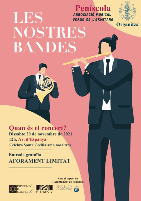 El concierto también servirá para presentar los nuevos y las nuevas músicos que se incorporaron a la banda de música el sábado pasado, 13 de noviembre: Andrea Biosca Beltrán (clarinete), Rodrido Ayza Pangua (percusión), Aneley García Tijeras (clarinete), María Ramos Albiol (flauta travesera), Josep Marqués Guzmán (trombón de vara) y Julia Blasco Bayarri (saxo alto).