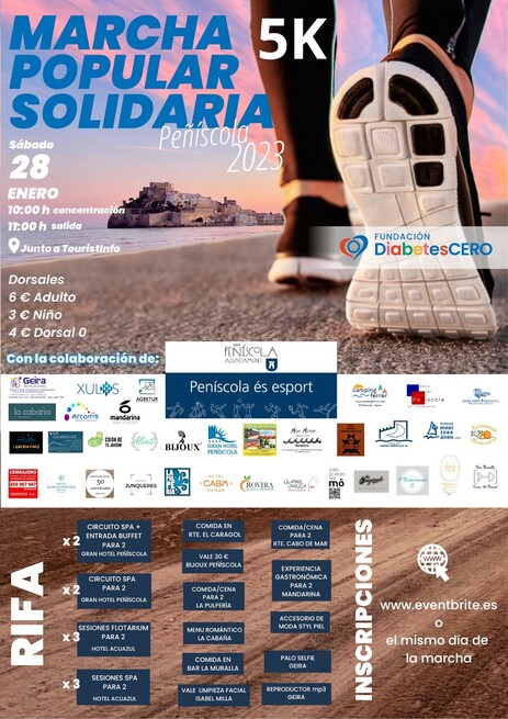 La actividad dará comienzo a las 10:00h en el paseo Marítimo de Peñíscola, junto a la Tourist Info, con la formalización de las últimas inscripciones y el reparto de dorsales. A las 11:00h iniciará la marcha popular de cinco kilómetros en la fuente Camilo José Cela y recorrerá el núcleo suburbano del municipio hasta regresar de nuevo al punto de partida. Al finalizar, tendrá lugar una rifa con 14 posibles premios y la clausura del evento.