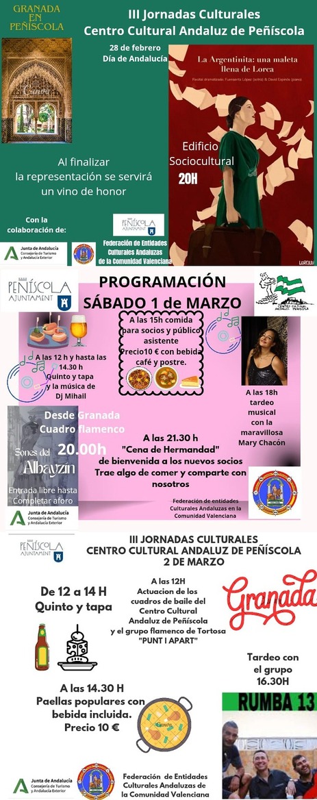 Del 28 de febrero y hasta el 2 de marzo el Centro Cultural Andaluz de Peñíscola propone las III Jornadas Culturales, con las que la agrupación conmemora el Día de Andalucía.
