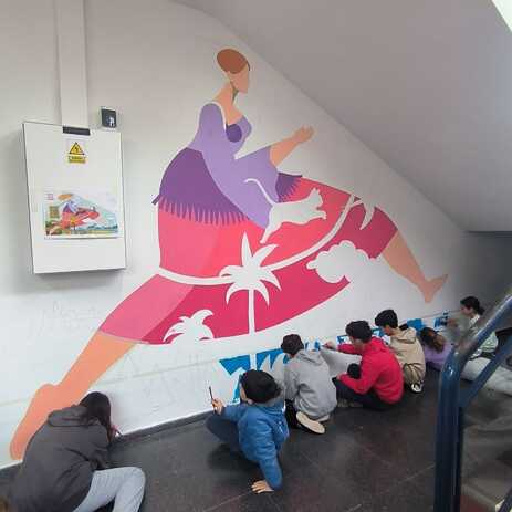 - "La dona que fa passos de gegant" protagoniza una pintura de gran formato en el interior del CEIP Jaime Sanz, en cuya elaboración participa el alumnado de sexto curso de primaria