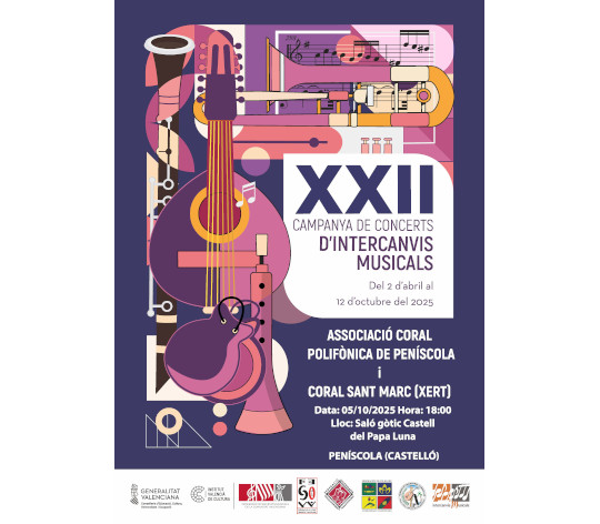 En aquesta ocasió, les agrupacions participants seran la Coral Polifònica de Peníscola, dirigida per Raquel Bayarri Bayarri, i la Coral Sant Marc de Xert, dirigida per Carlos Vives Sebastià, que ens oferiran un concert de música vocal amb peces individuals i també conjuntament.