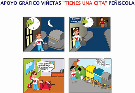 El interior del folleto, descubre la trama propuesta y es que cuando se abre el interior ya figura: Peñíscola tienes una cita, que viene a decir, “Peñíscola tienes un compromiso”, desarrollando todos los puntos claves para una actuación adecuada en nuestra cita diaria de sacar la basura. También se ha acompañado el texto de viñetas y dibujos para hacer más fácil su comprensión visual a los más jóvenes y concienciarlos desde muy pequeños, así como a la población extranjera siendo así mucho más visual, comprensible y directo el mensaje.