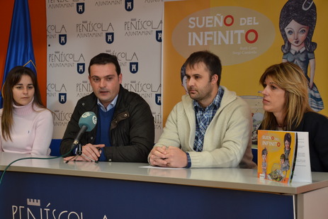 Ruth Caro y Sergi Cambrils, autores del cuento infantil Sueño del infinito ambientado e inspirado en Peñíscola, han comparecido en rueda de prensa hoy junto al alcalde, Andrés Martínez y la concejala de Cultura, Amparo Bayarri, para animar a vecinos, amigos y amantes de la lectura a conocer su proyecto hecho realidad gracias a la colaboración del Ayuntamiento de Peñíscola y la Diputación de Castellón.