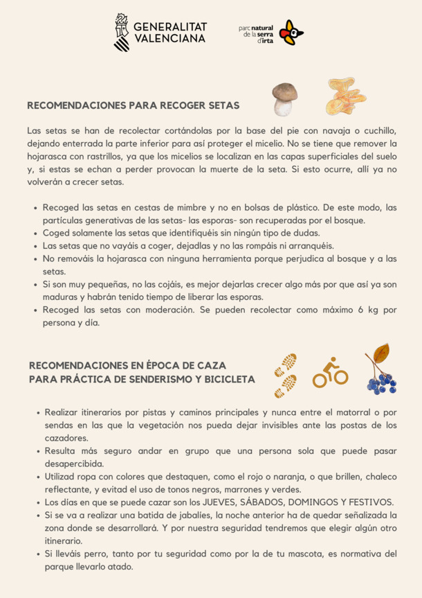 - No está permitido hacer fuego. Excepto en el área recreativa de la Ermita Sant Antoni que dispone de paelleros, siempre que no estén precintados. Además, si fumas, apaga y recoge tus colillas.